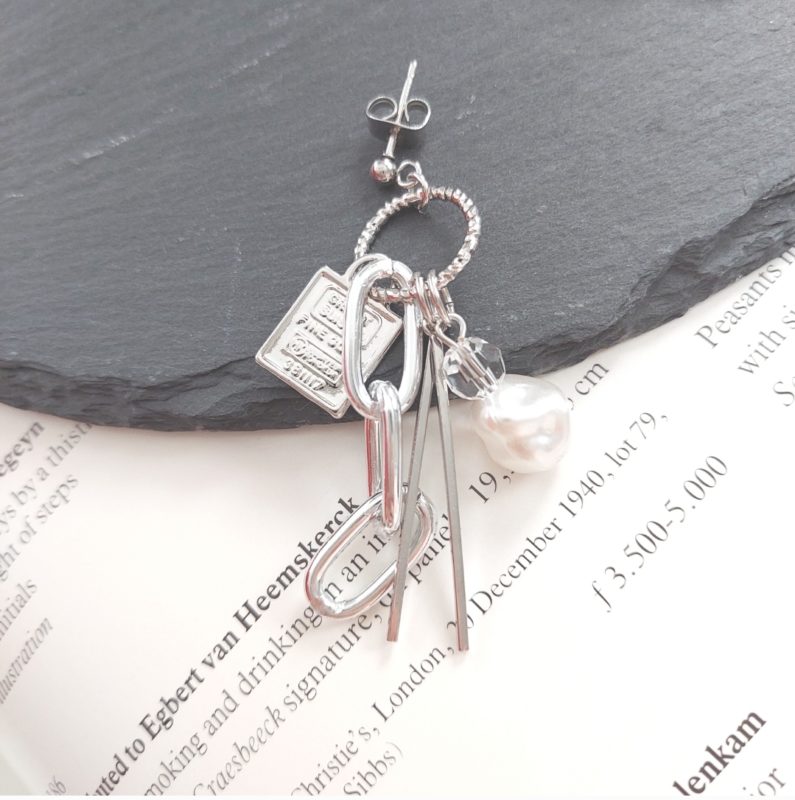 65.モードなパールアクセントピアス/イヤリング ¥ 2980 ・モード感たっぷりのパールビーズ付きデザインピアス ・ピアス部分はサージカルステンレス製で、アレルギーを起こしにくく安心! ・チェーン部分はアルミ素材を使用し、見た目に反してとても軽量 ・メタルパーツやコインチャーム、パールを組み合わせた個性派デザイン ・シルバーの輝きが耳元を印象的に演出 ・カジュアルにもモードにも合わせやすい万能アイテム ピアスヘッド変更 無料 サイズ ・全長約6㎝ 素材 ■スクエアモチーフ・スティック・丸カン・Tピン→ロジウム素材。変色・黒ずみ防止コーディングをしております。 JIS基準の有害性ゼロの安心コーティング剤です。 ■チェーン→アルミ ■ピアス→サージカルステンレス304 ■パールビーズ ご注文はコチラ Creema minne