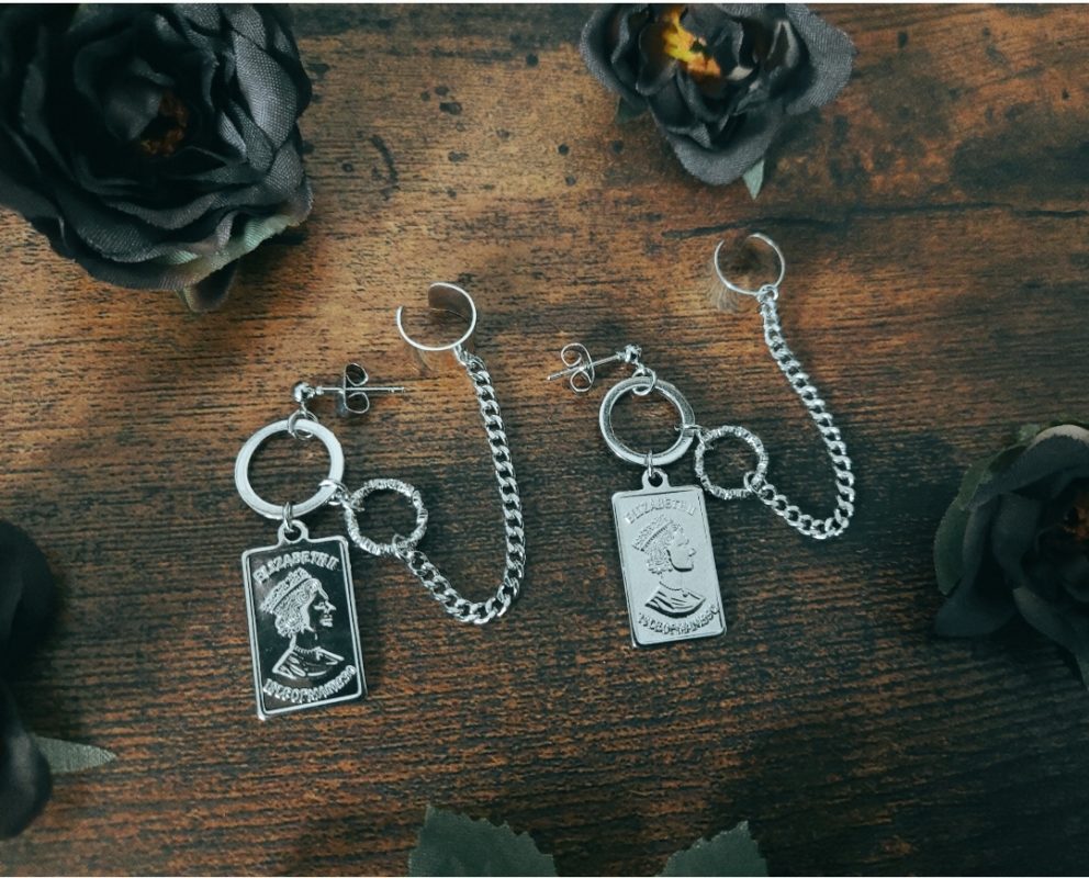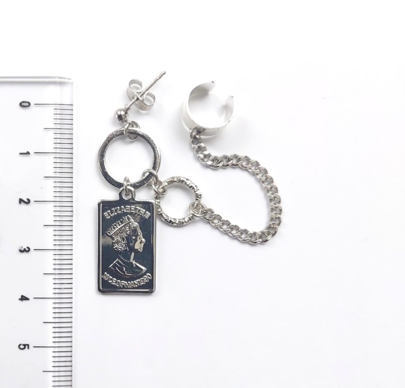 王妃モチーフのプレートを使用したカフ付きチェーンピアス*