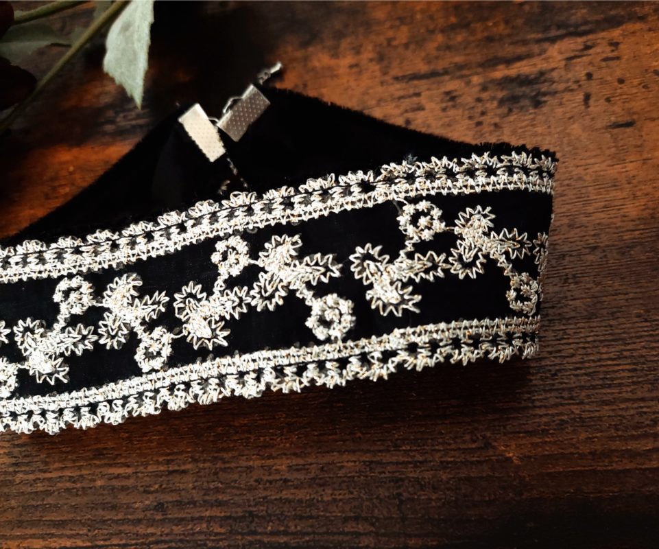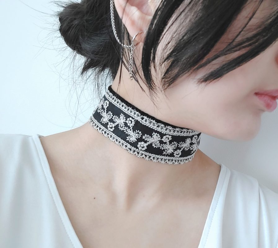 インド刺繍レースチョーカー インド刺繍リボンを使用したシックなチョーカー* 裏地はふんわり素材のベロアで付け心地も良く、高級感ある仕上がりになっています。 金属パーツは全てサージカルステンレス使用で こちらもお肌に優しく、長持ち素材となっています* サイズ ・リボン長さ約33センチ、+アジャスターの6㎝ ・リボン幅4㎝ 素材 ・リボン長さ約33センチ、+アジャスターの6㎝ ・リボン幅4㎝ ご注文はコチラ Creema minne